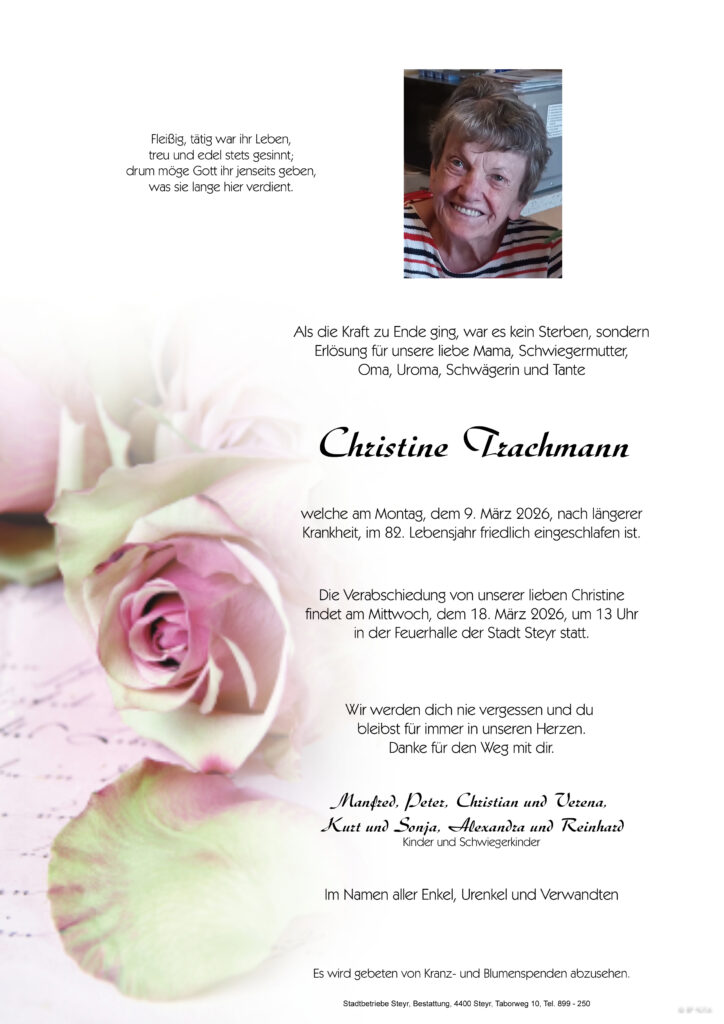 Die Verabschiedung findet am Mittwoch, dem 18. März 2026, um 13 Uhr in der Feuerhalle Steyr statt