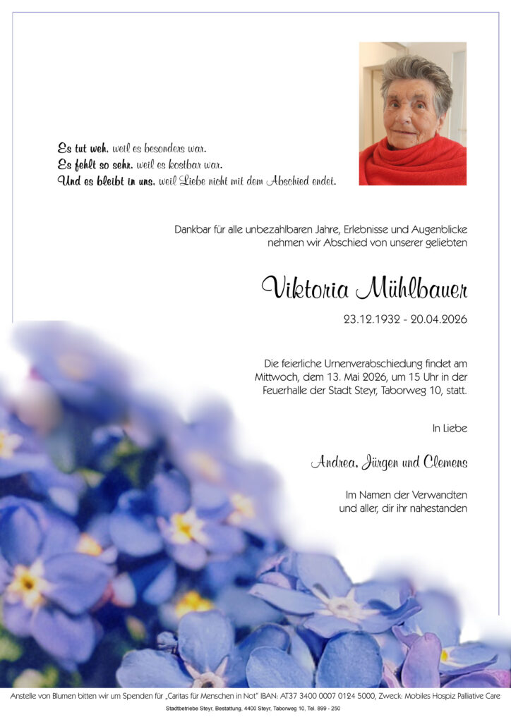 Die feierliche Urnenverabschiedung findet am Mittwoch, dem 13. Mai 2026, um 15 Uhr in der Feuerhalle Steyr statt